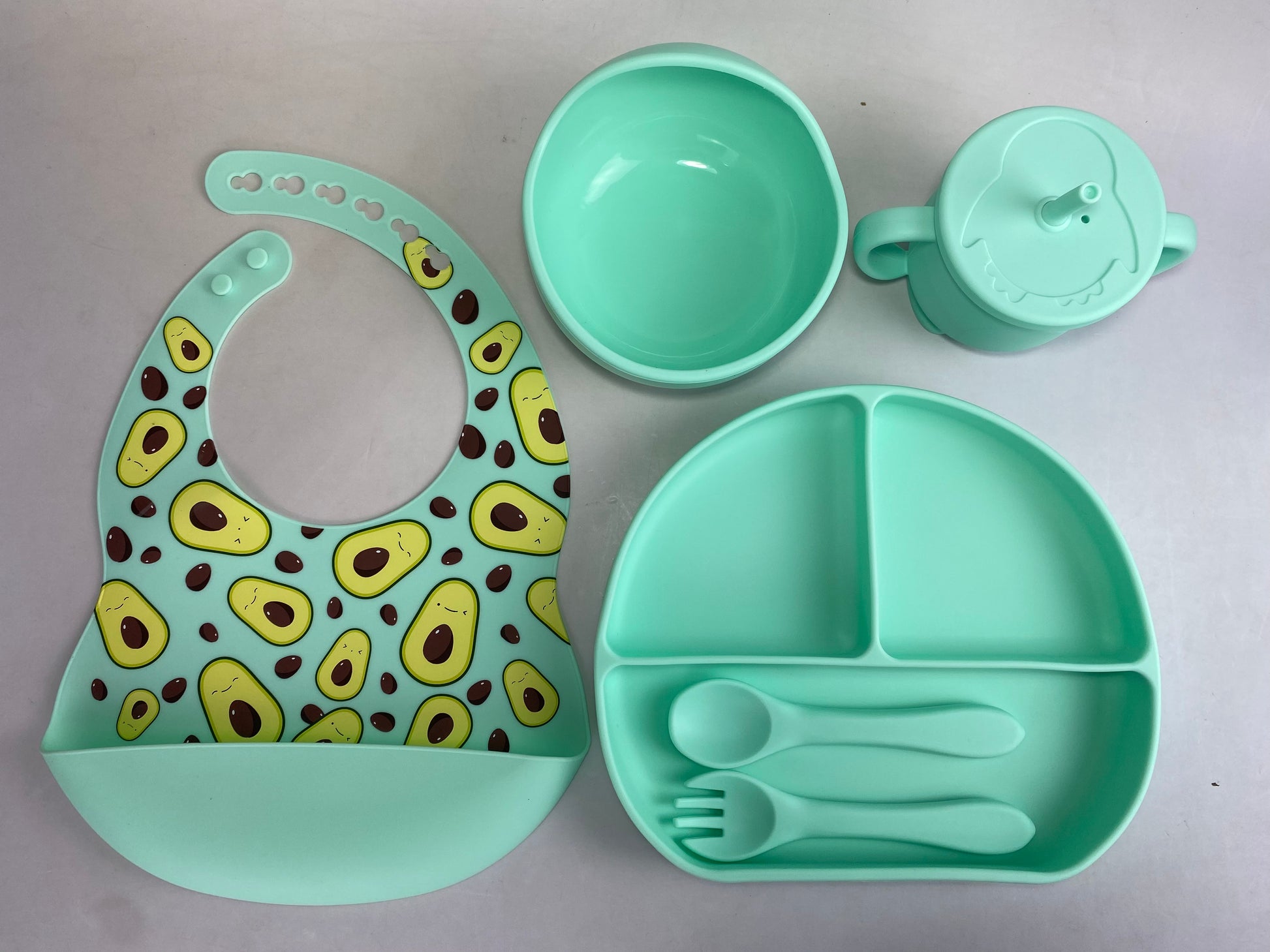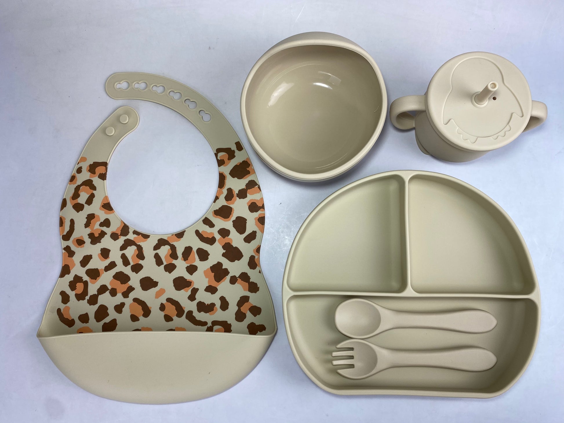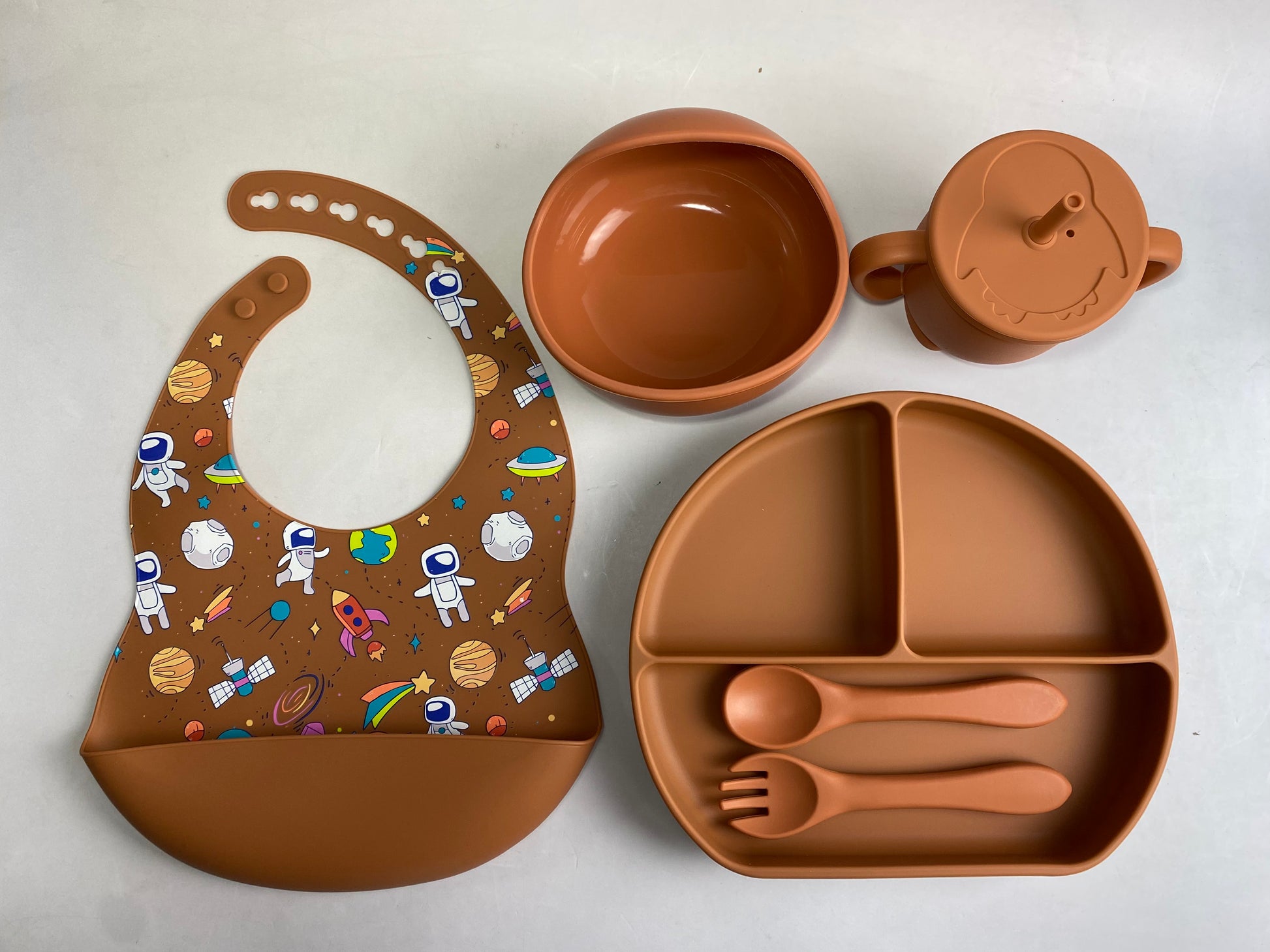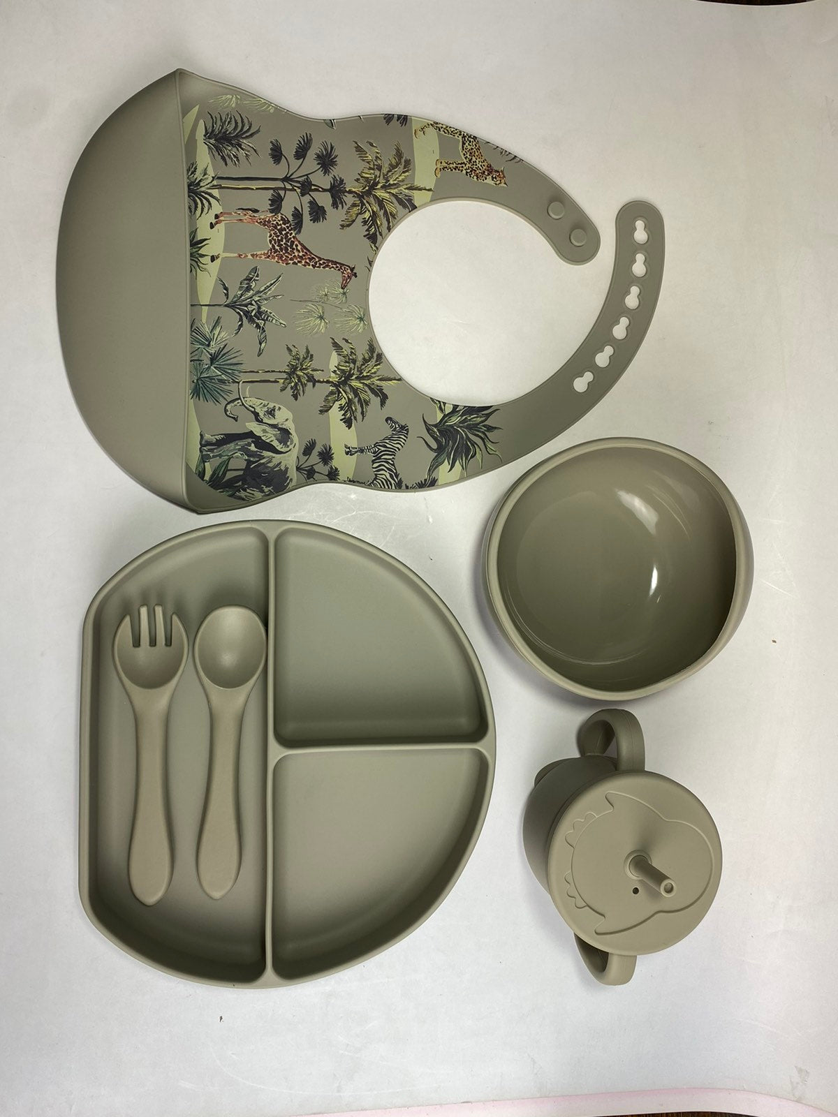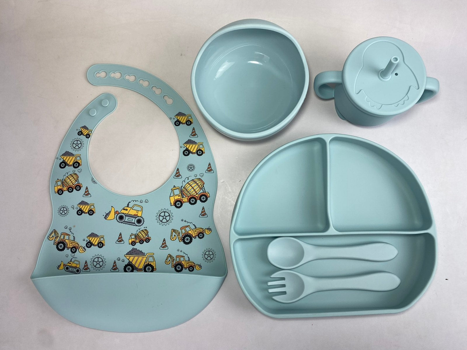 Printed Silicone Bib, Silicone Suction Plate, Silicone Suction Bowl, Feeding Spoon, Feeding Fork, Silicone Sippy Cup with Handle