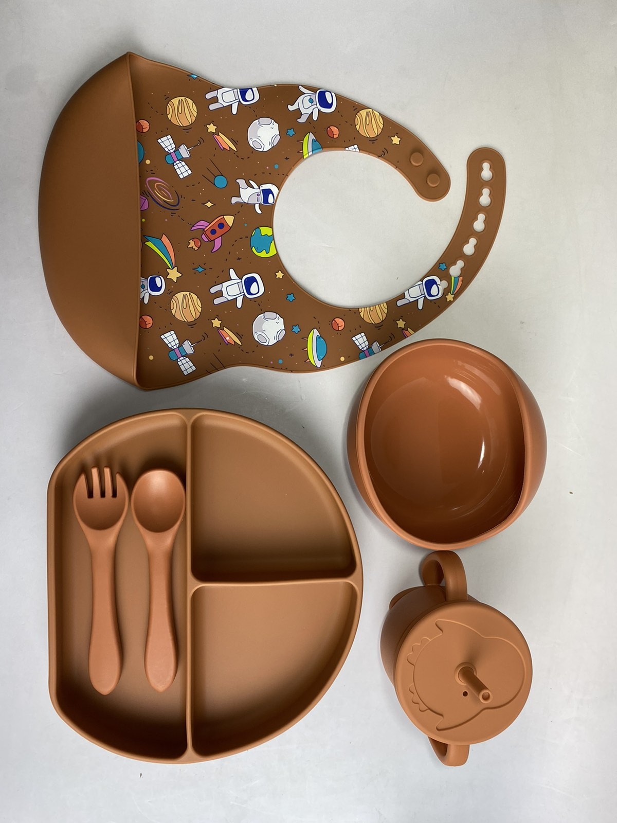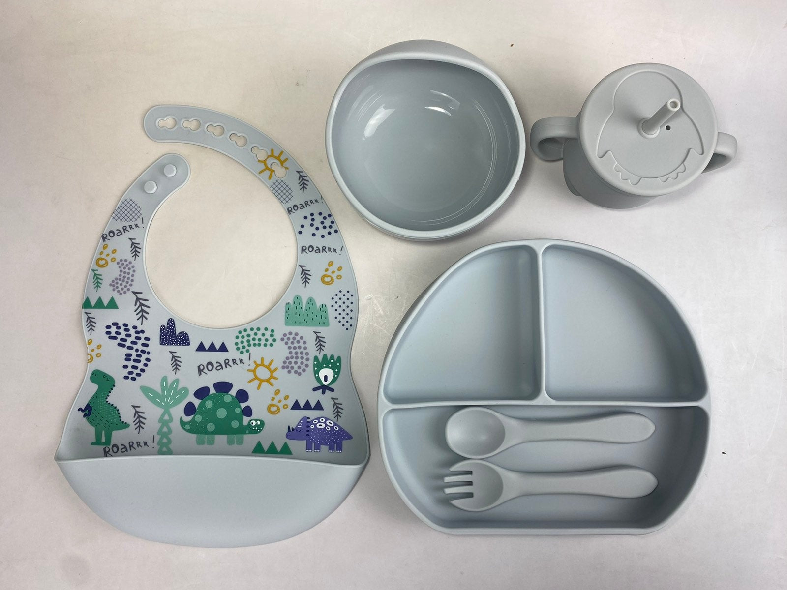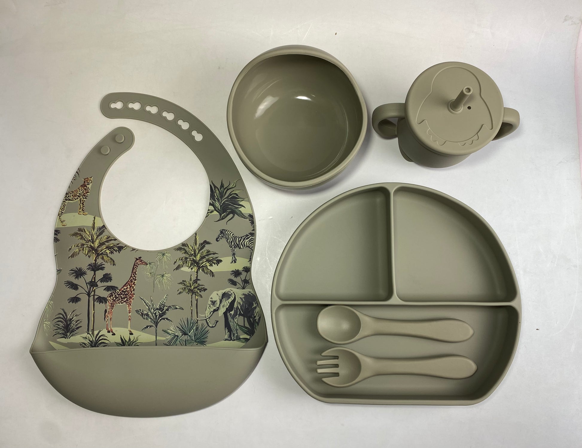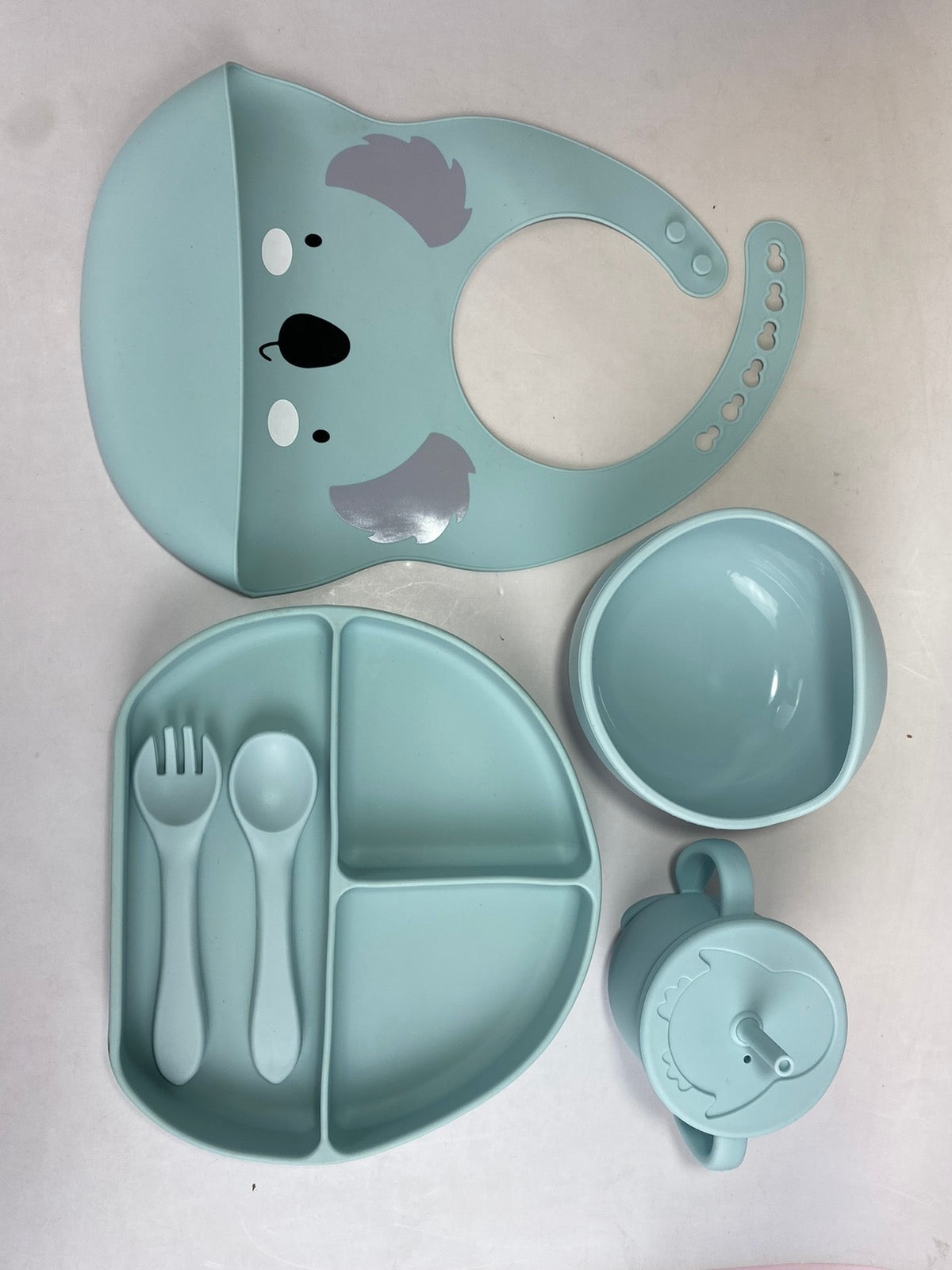Printed Silicone Bib, Silicone Suction Plate, Silicone Suction Bowl, Feeding Spoon, Feeding Fork, Silicone Sippy Cup with Handle