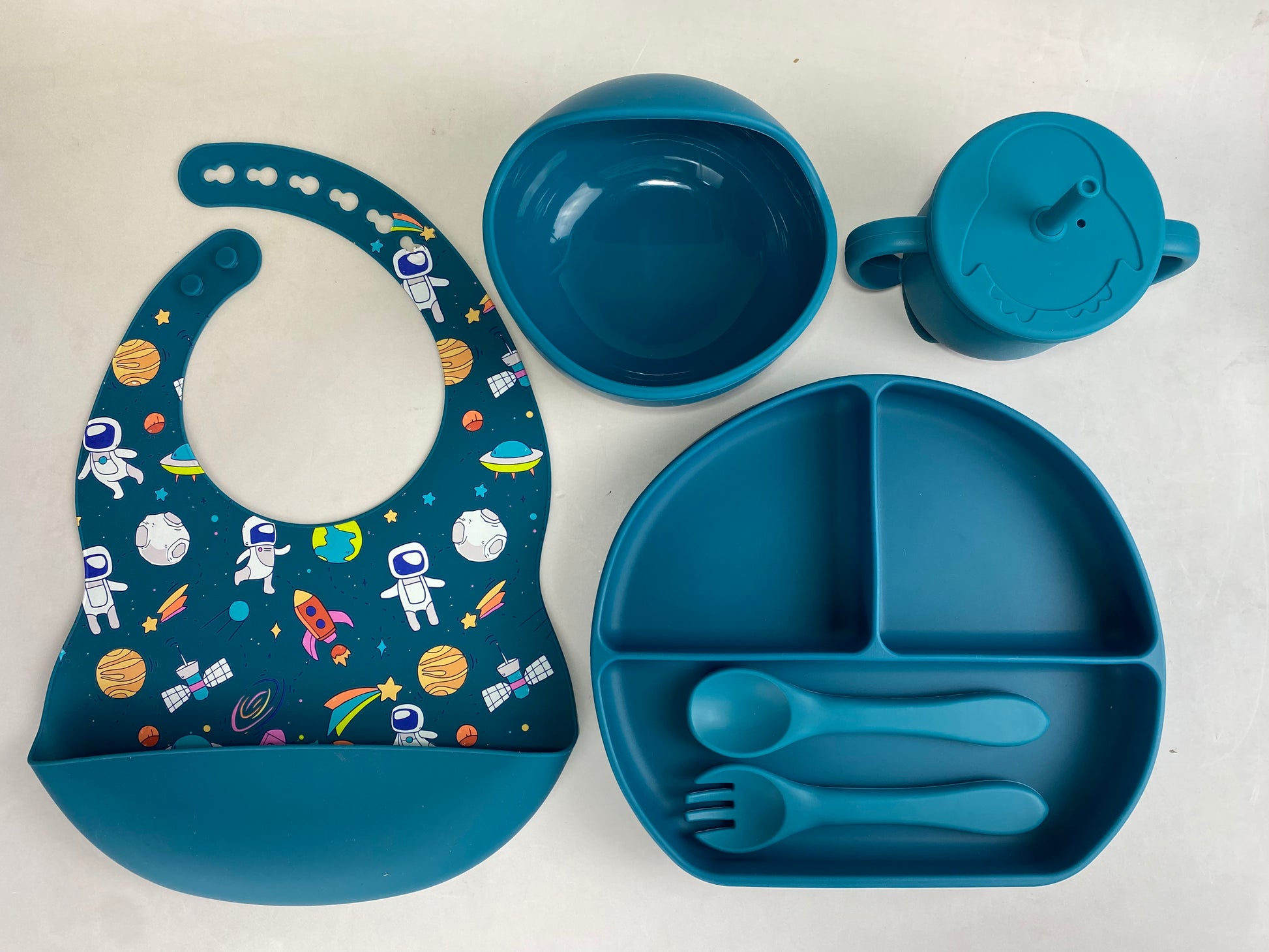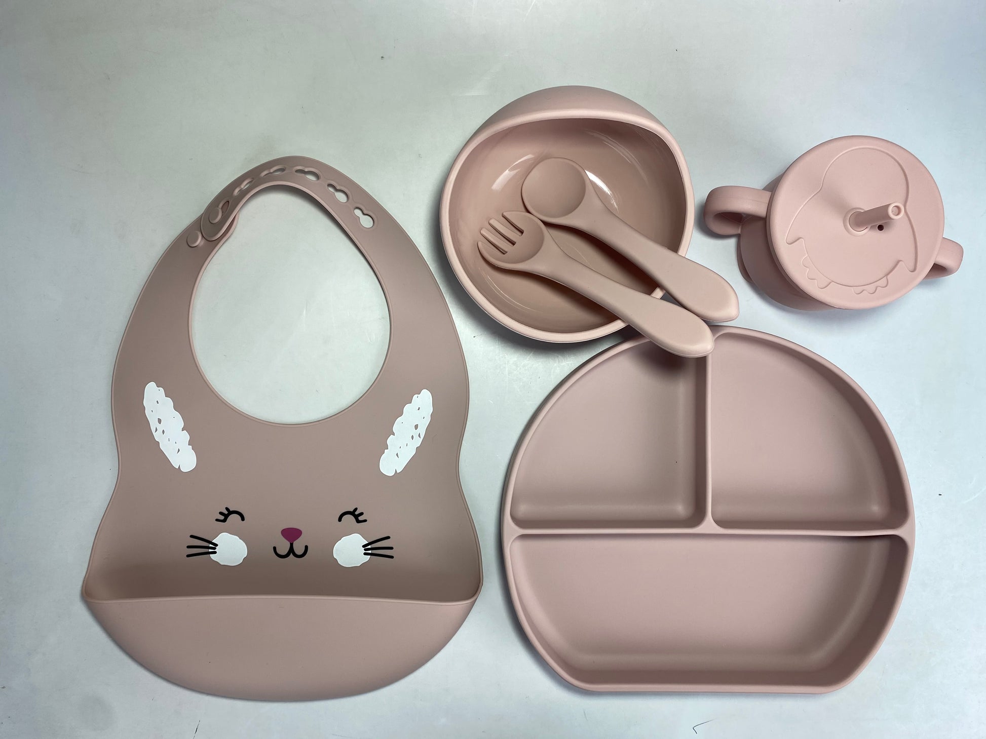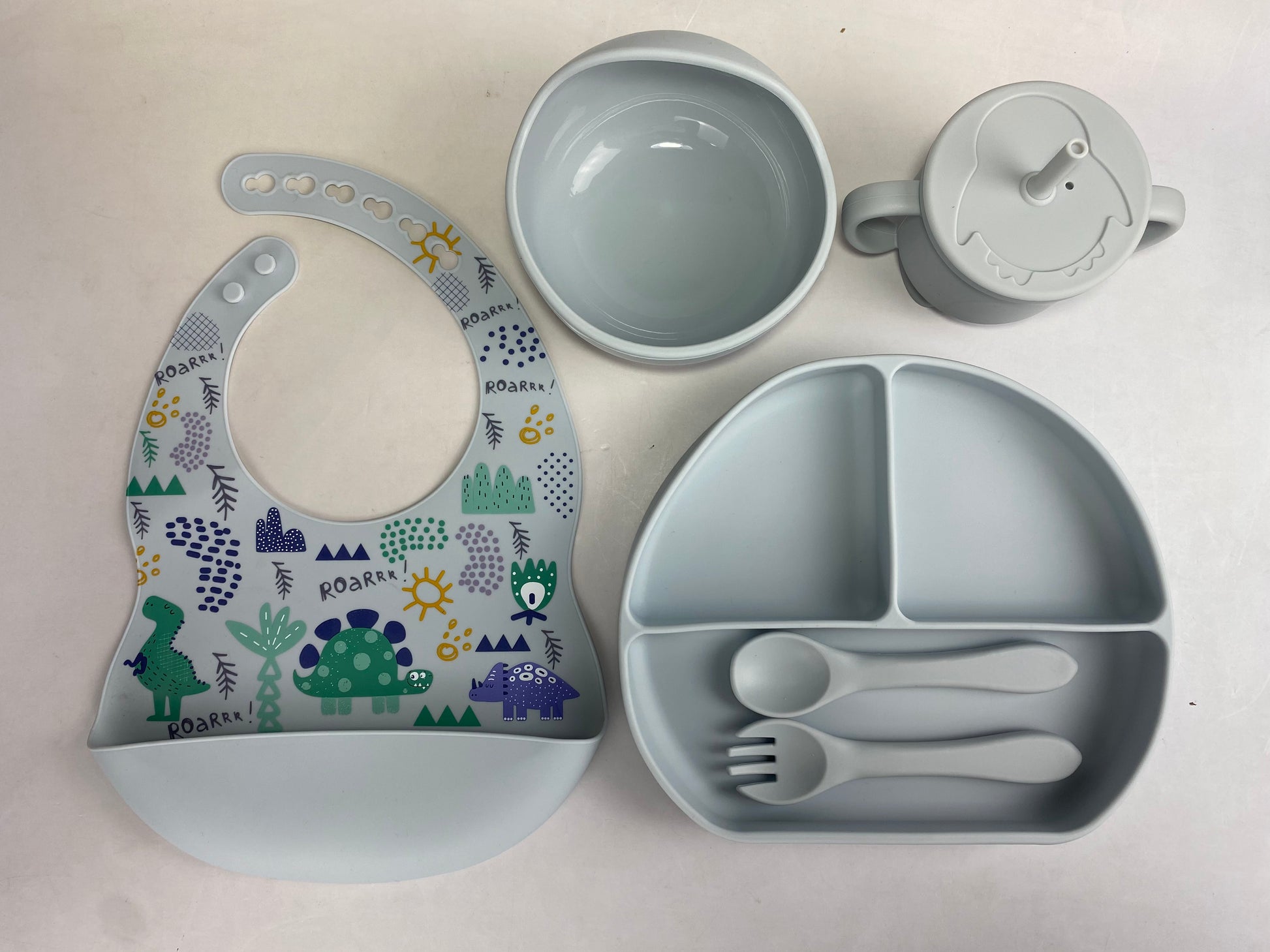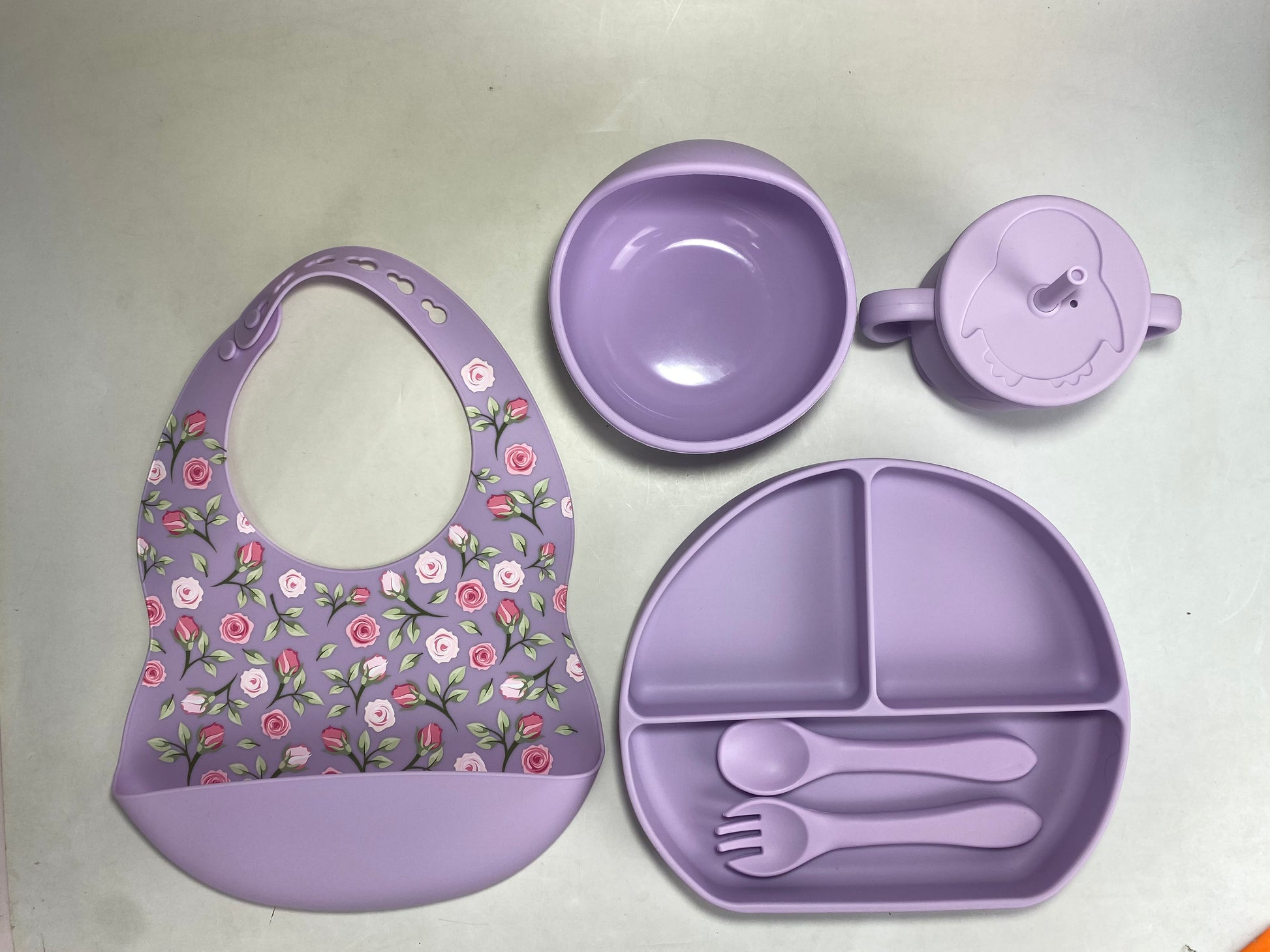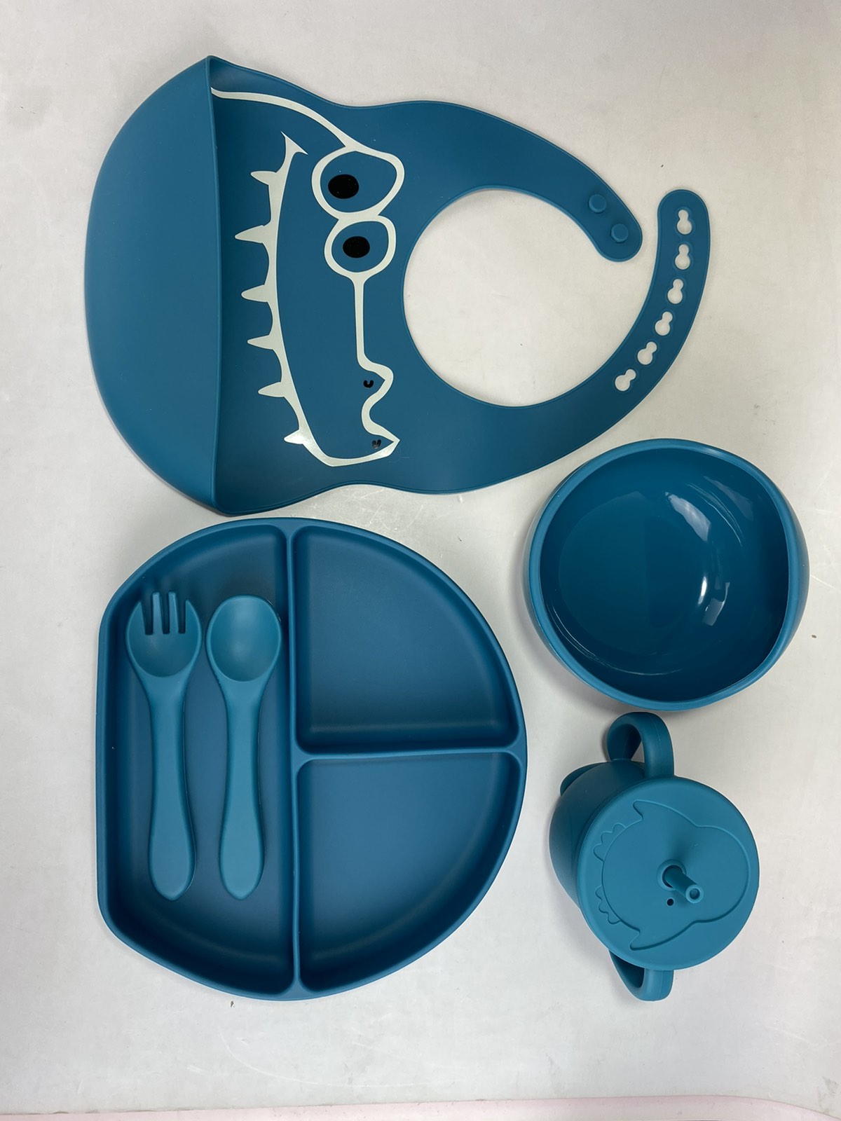 Printed Silicone Bib, Silicone Suction Plate, Silicone Suction Bowl, Feeding Spoon, Feeding Fork, Silicone Sippy Cup with Handle
