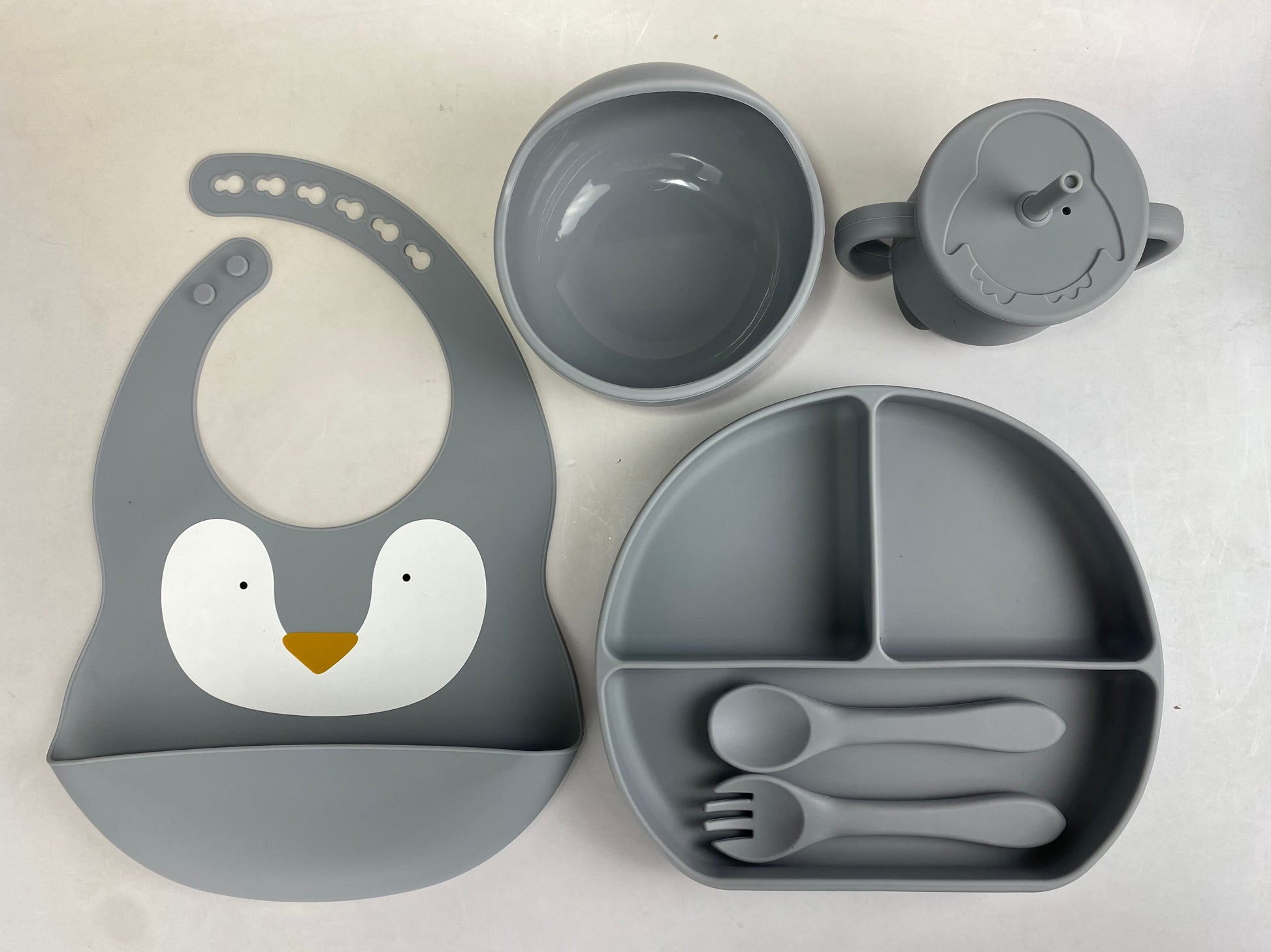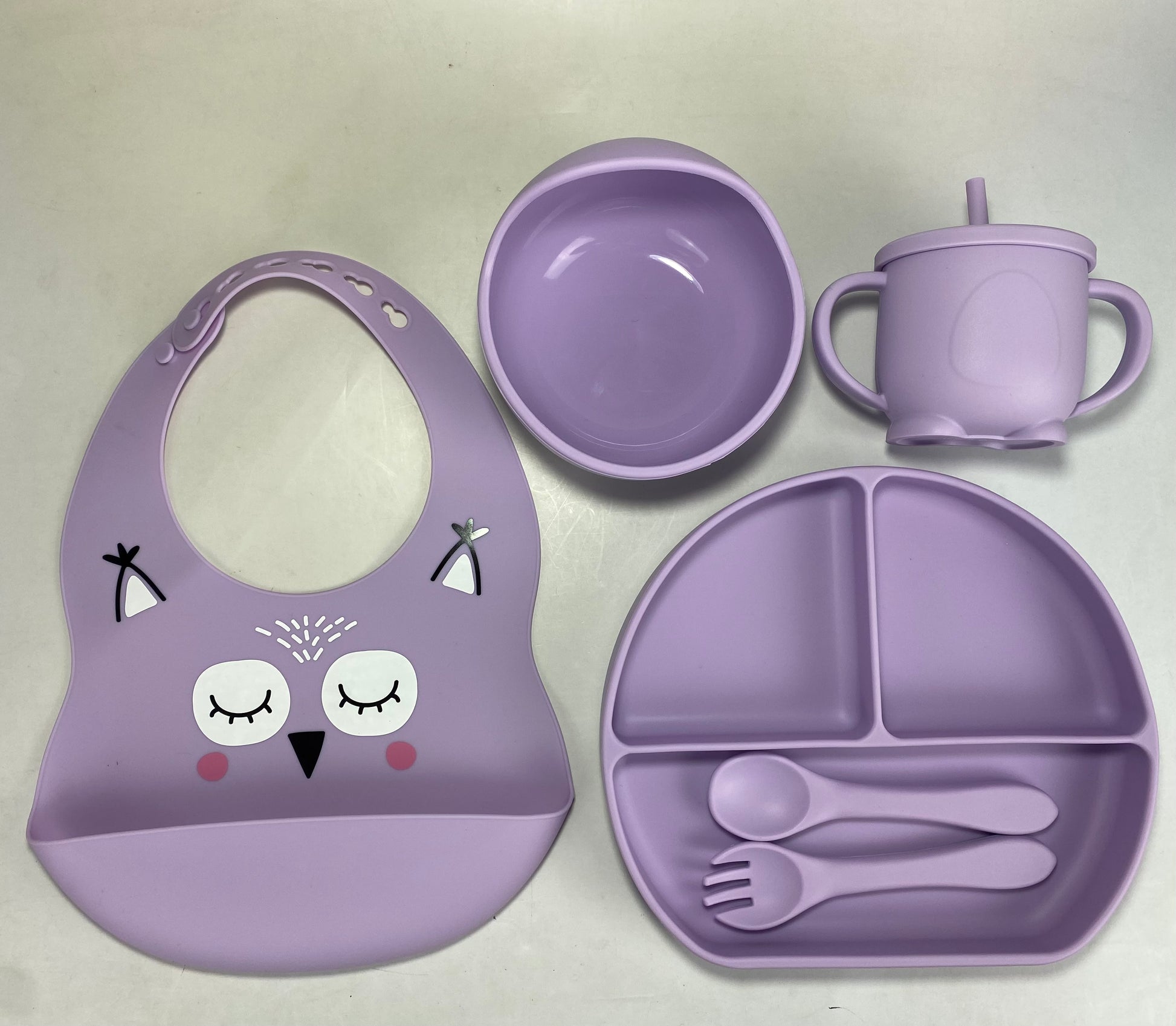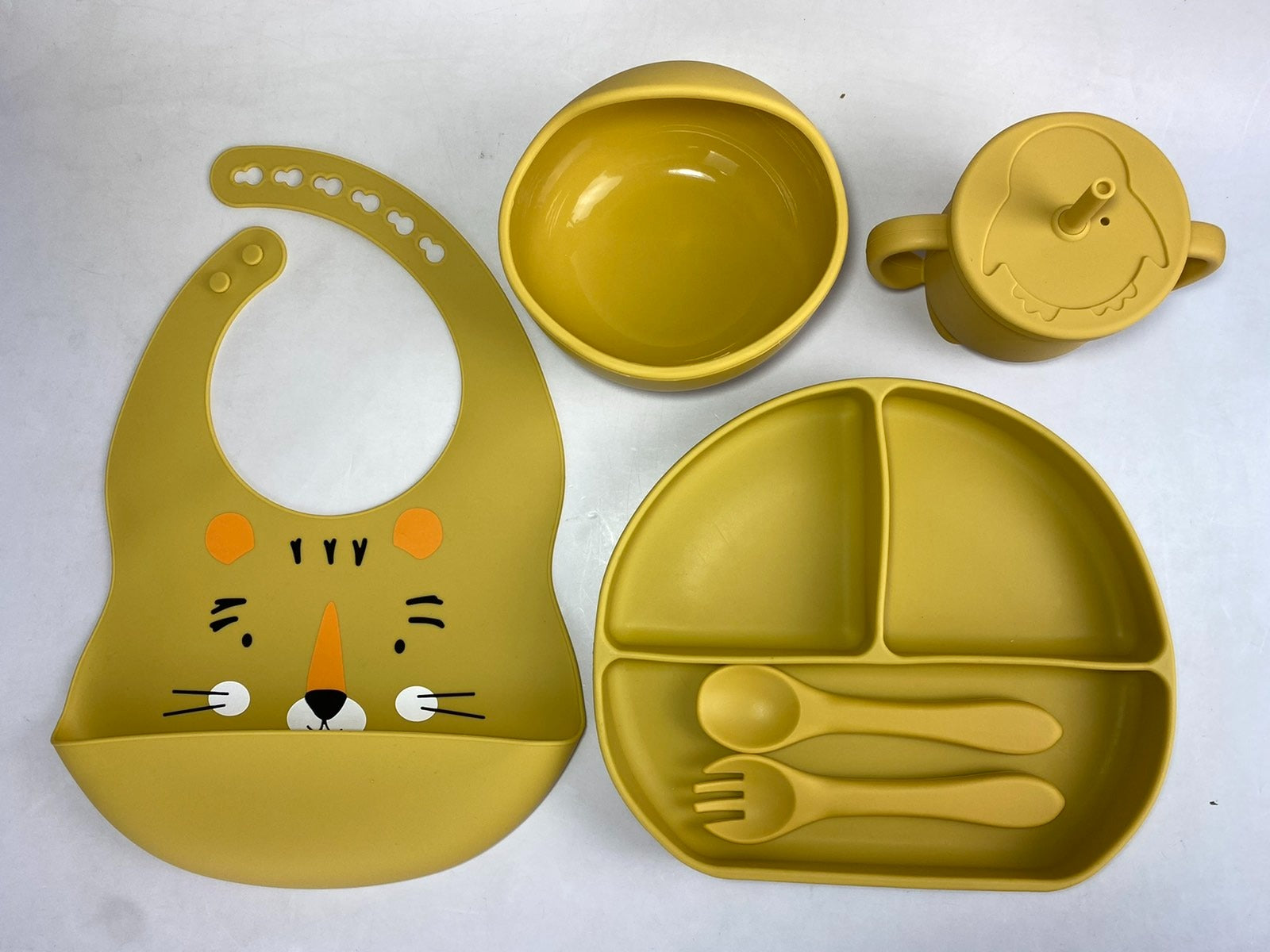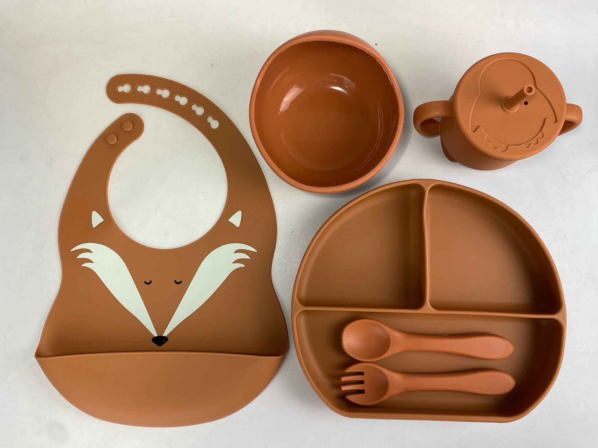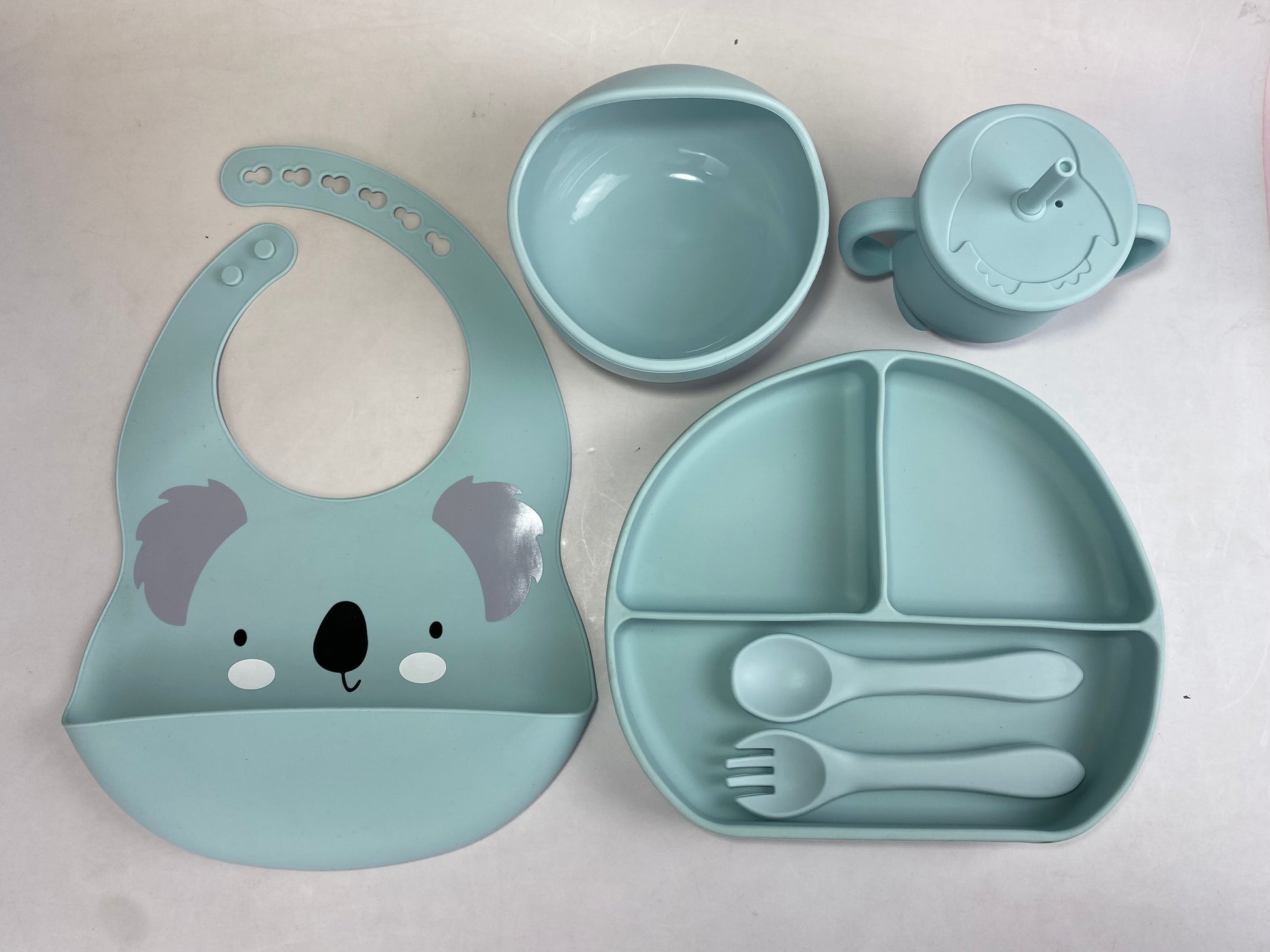 Printed Silicone Bib, Silicone Suction Plate, Silicone Suction Bowl, Feeding Spoon, Feeding Fork, Silicone Sippy Cup with Handle