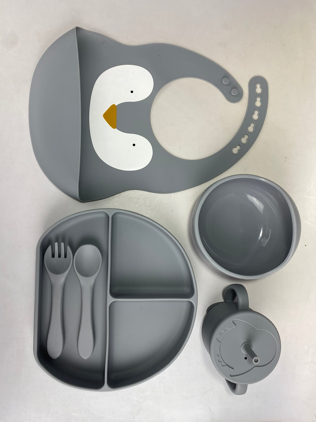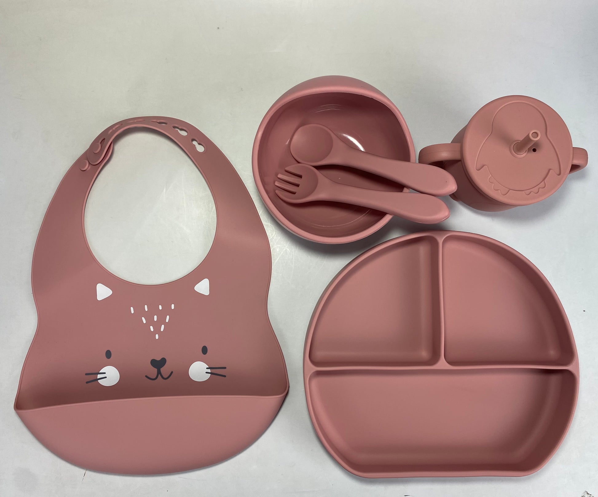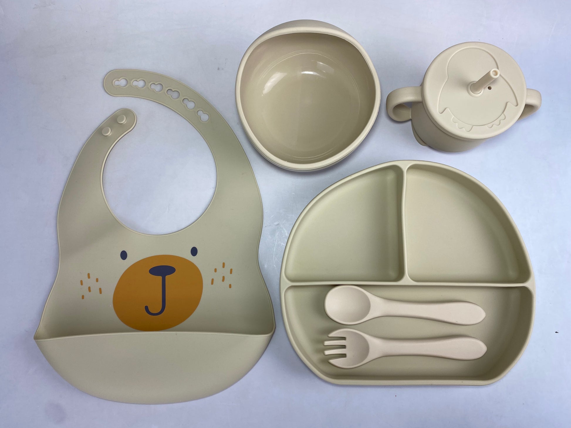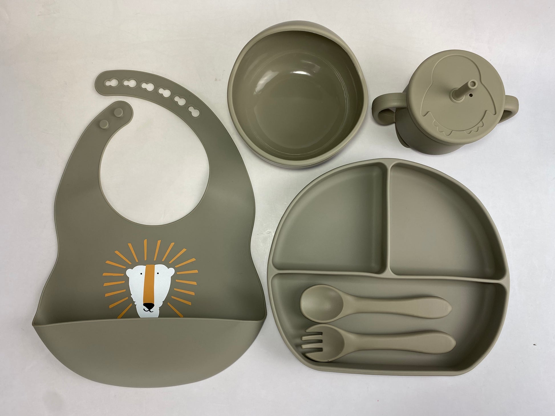 Printed Silicone Bib, Silicone Suction Plate, Silicone Suction Bowl, Feeding Spoon, Feeding Fork, Silicone Sippy Cup with Handle
