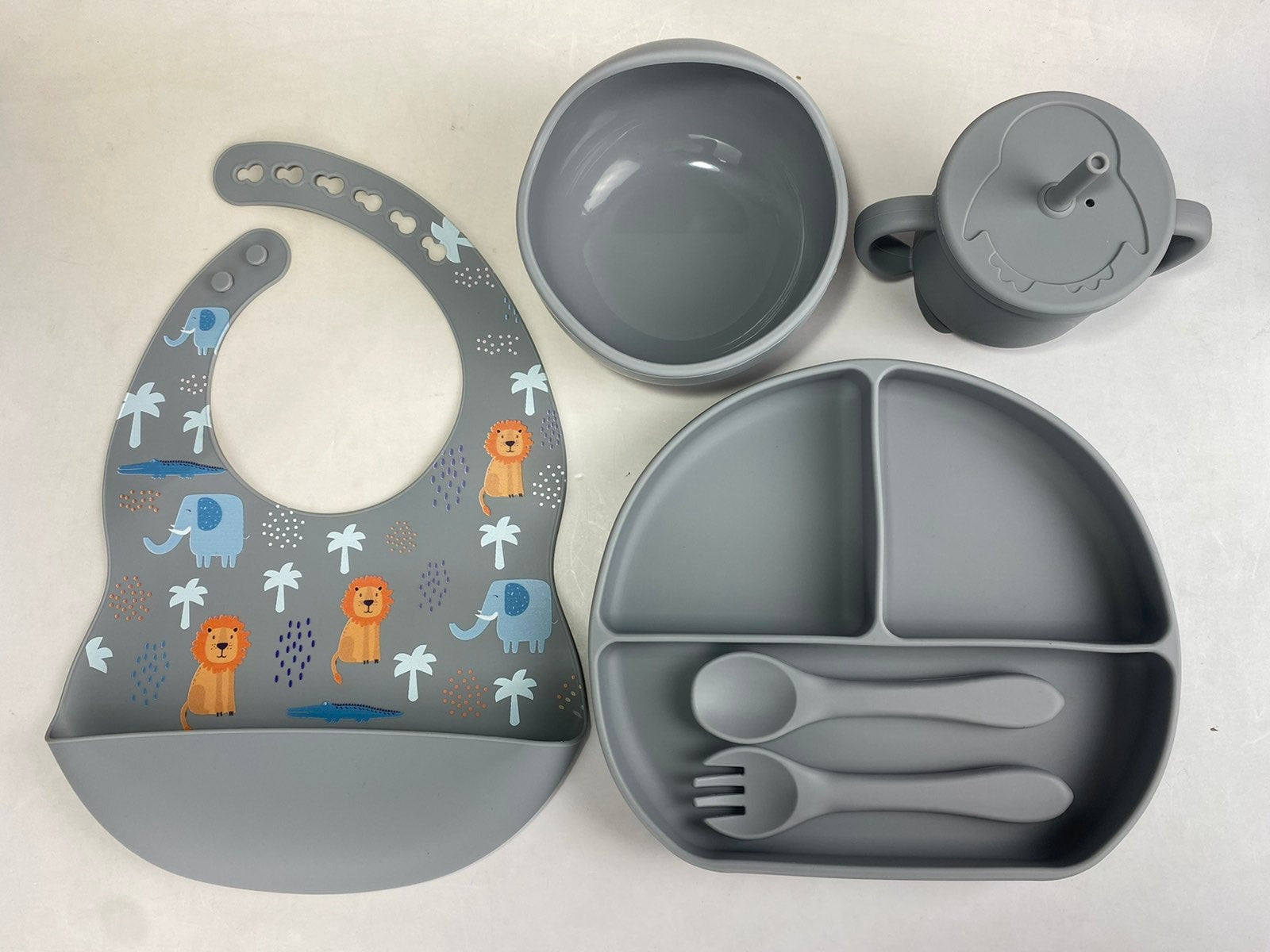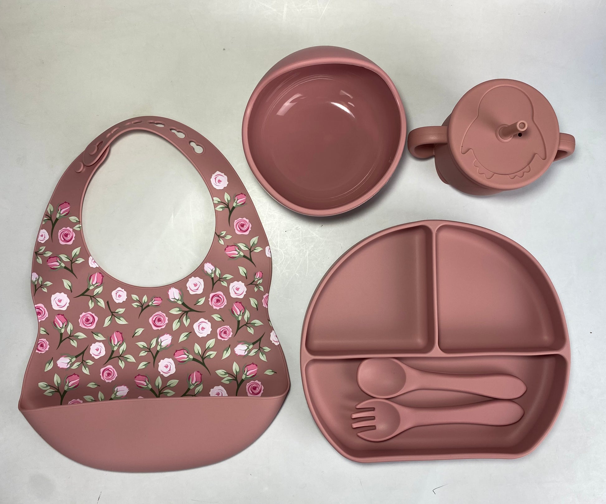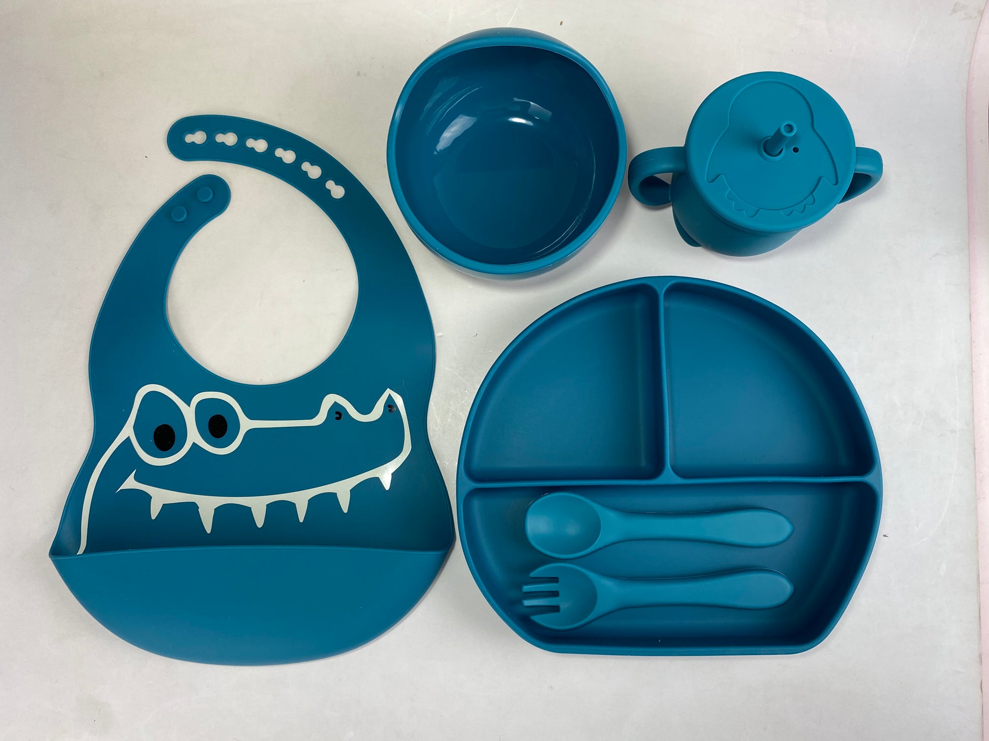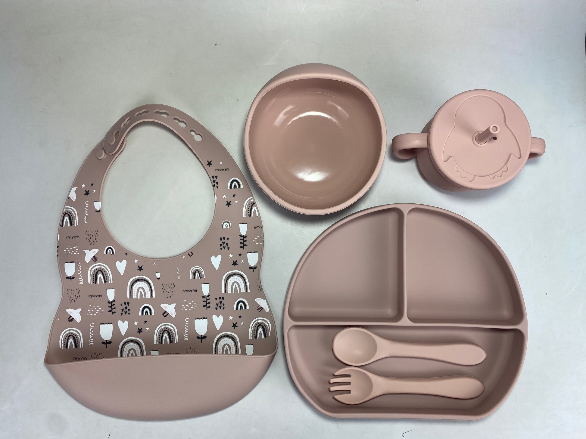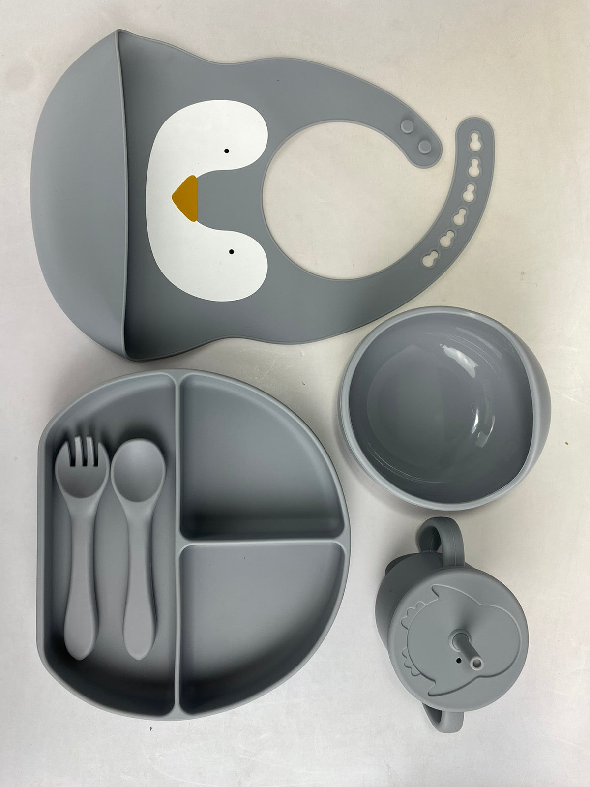 Printed Silicone Bib, Silicone Suction Plate, Silicone Suction Bowl, Feeding Spoon, Feeding Fork, Silicone Sippy Cup with Handle