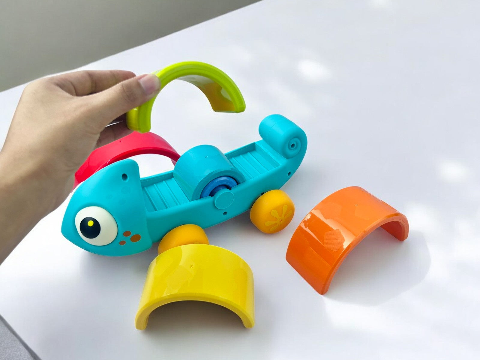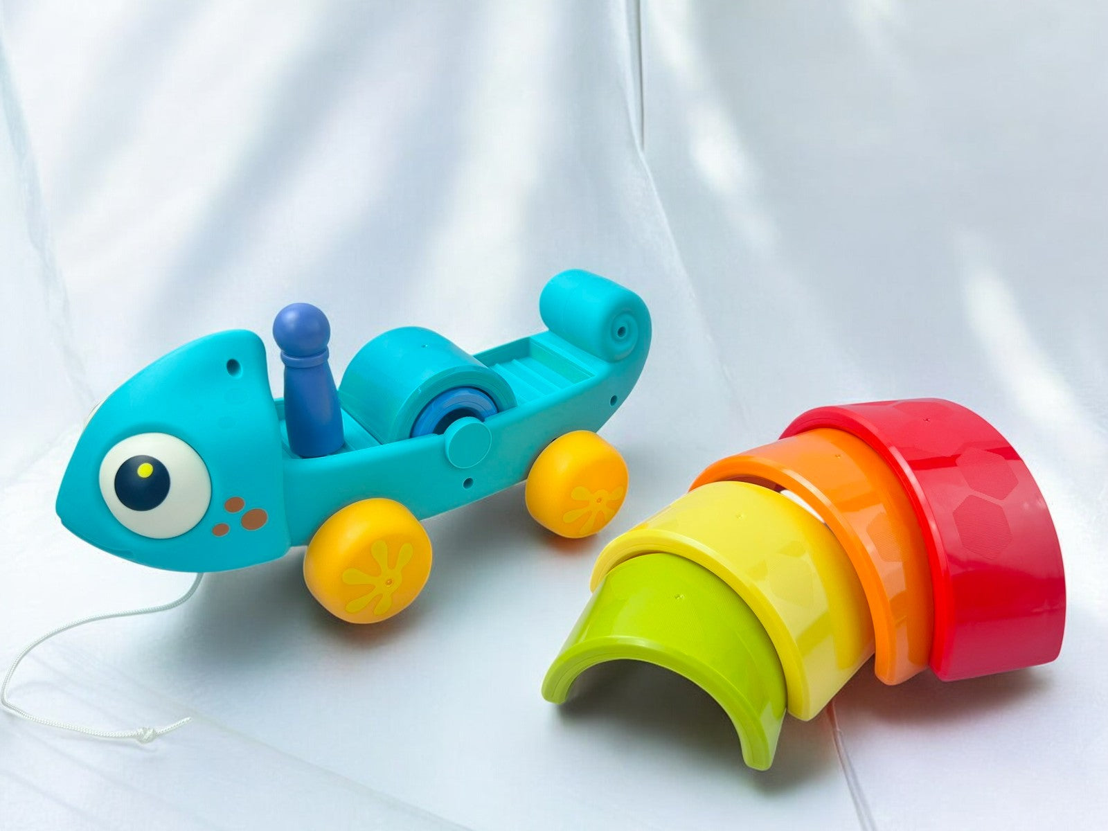 The Baby Rainbow Chameleon is a Montessori-style, interactive toy for toddlers 18 months and up. Pull the string to watch the chameleon move and encourage your child to chase it. The set includes 7 colorful rainbow arches for stacking, sorting, and learning colors—boosting hand-eye coordination, creativity, and early learning skills. Perfect for playful, hands-on development!