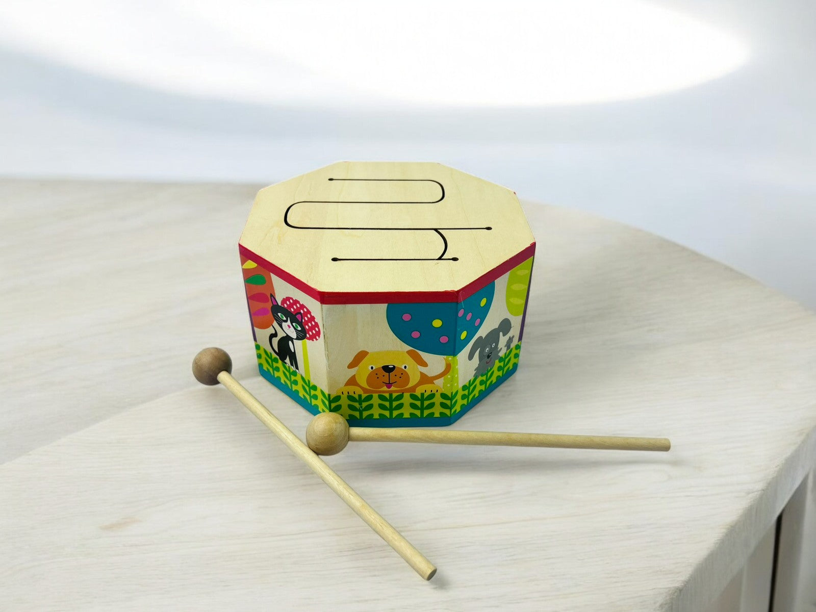 Package Includes: 1 Wooden Three Tone Drum Toy (with 2 Drumsticks)